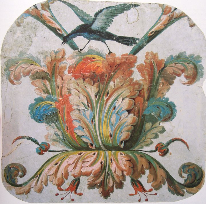 הדפסה אמנותיתקומפוזיציה עשירה וציורית של ציפורים מעופפות, עלי אקנתוס ופרחים חיים, המזכירה ציורי קיר מהמאה ה-17. ההדפס מעורר תחושה של תנועה אלגנטית ושפע טבעי שופע.