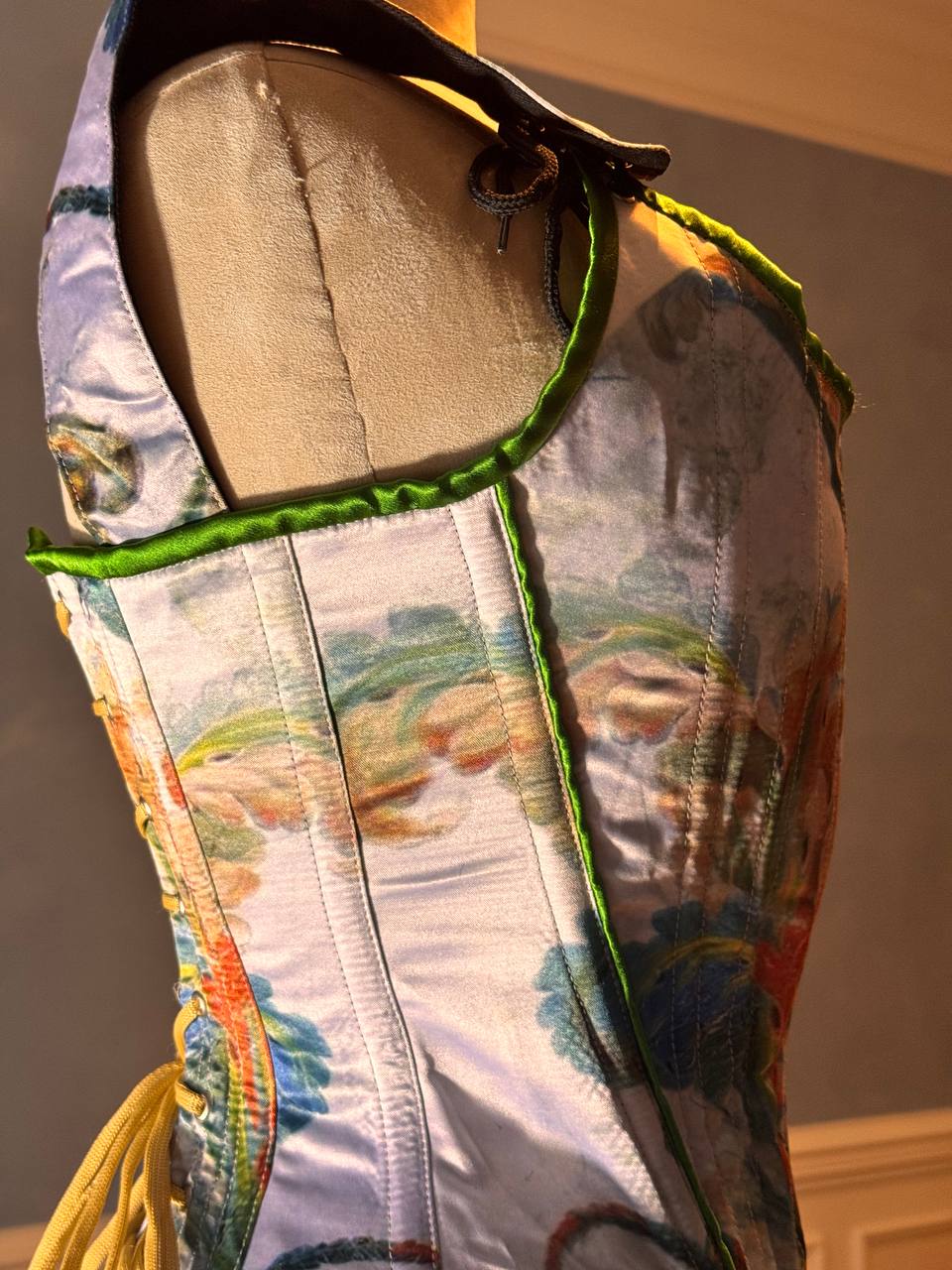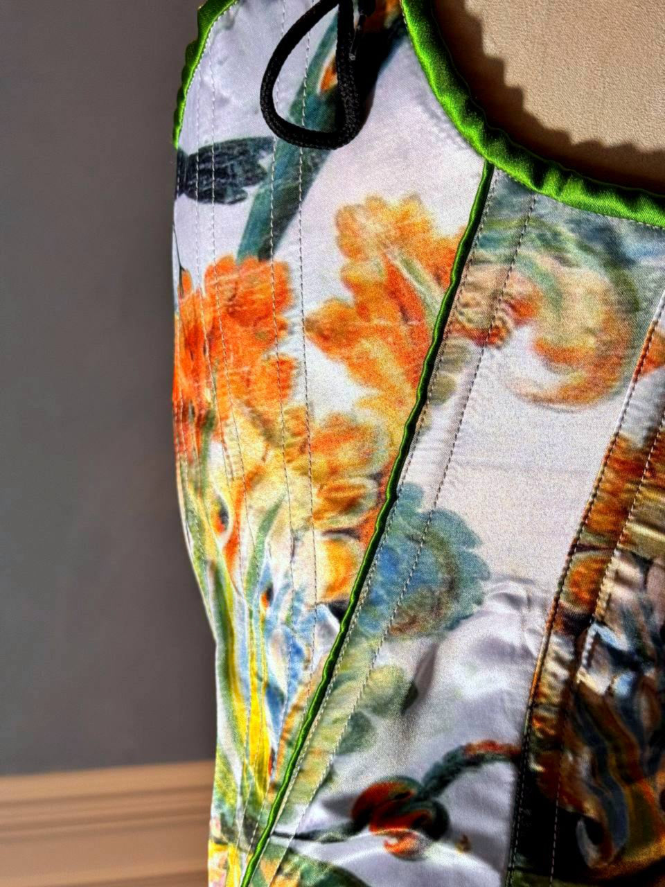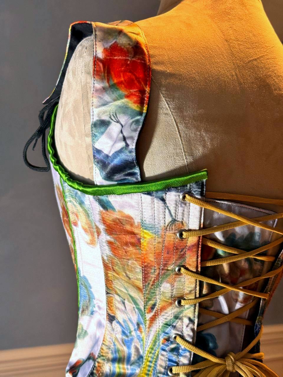 קורסט מעל החזה בסגנון פיסולי בהשראת מוטיבים קלאסיים של ציורי שמן, המציג את היצירה האמנותית התוססת אקאנתוס ופלייט — חגיגה של תנועה, טבע ונשיות. בעבודת יד כחלק מאוסף האמנות Corsettery, יצירה זו משלבת אופנה ואמנות יפה בצורה שניתן ללבוש.
