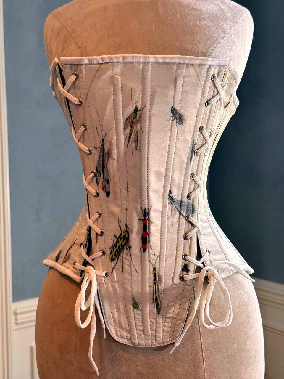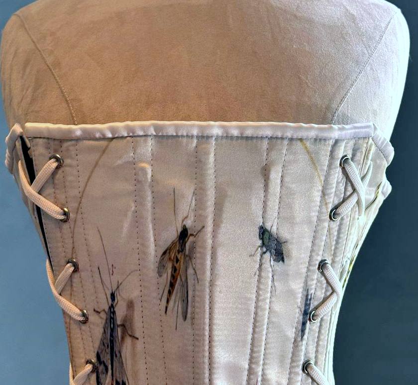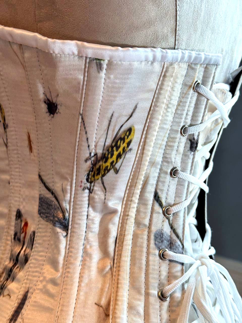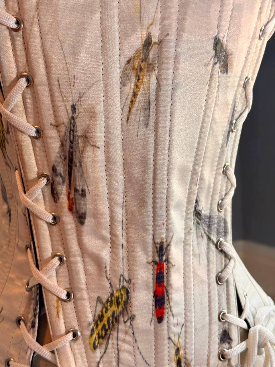 הסילואטה המבנית מזכירה קורסטים עתיקים, אך הקסם שלה טמון בשקט החי של העיצוב: כל חרק נראה כמתכונן לפרוש את כנפיו ולברוח אל הלילה. תעלות עצם רכות וסידורי שרוכים בגימור ידני מאזנים בין אלגנטיות למתינות, בעוד הרקע מסאטן השן זוהר בעדינות תחת אור הנר, כאילו מואר באש אסורה.