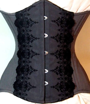 Corsetto esclusivo ricoperto da lacci. Collezione di corsetteria Lace Addicted. Corsetto autentico con ossa d'acciaio sottoseno con ossa d'acciaio