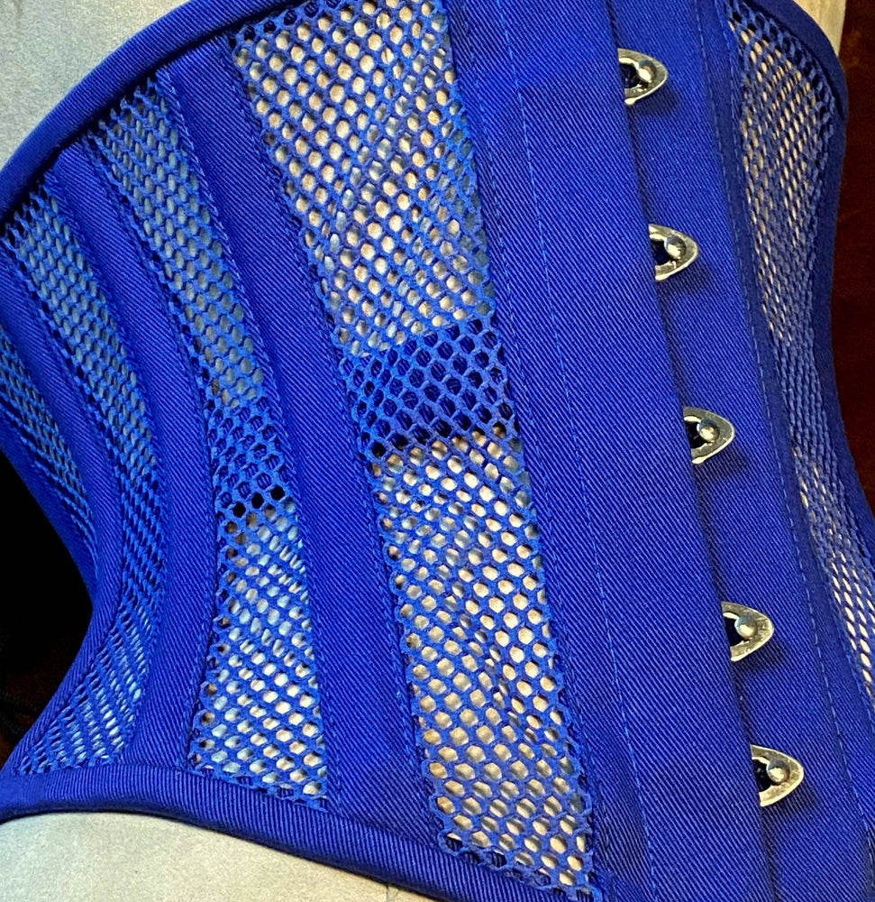 Corsetto sottoseno disossato in vero acciaio di rete blu trasparente e cotone. Corsetto da allenamento in vita reale per allacciatura stretta.