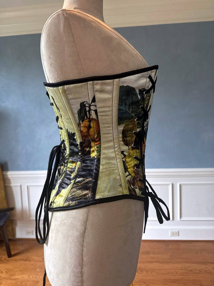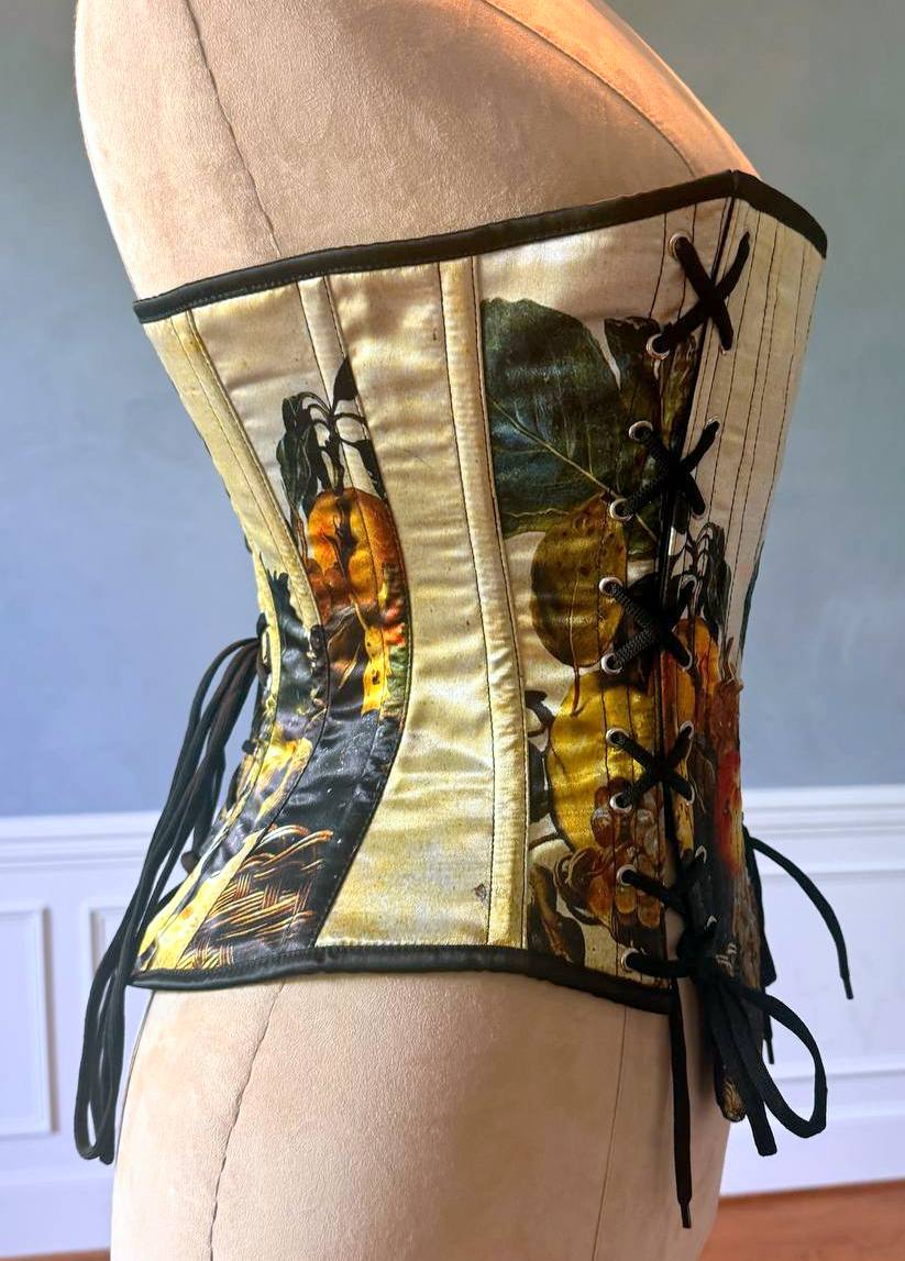 Step into a masterpiece with this Caravaggio-inspired overbust corset, a luxurious blend of fine art and vintage fashion. Featuring a vivid fruit still life print from one of Caravaggio's iconic works, this corset transforms baroque elegance into a bold, structured silhouette.