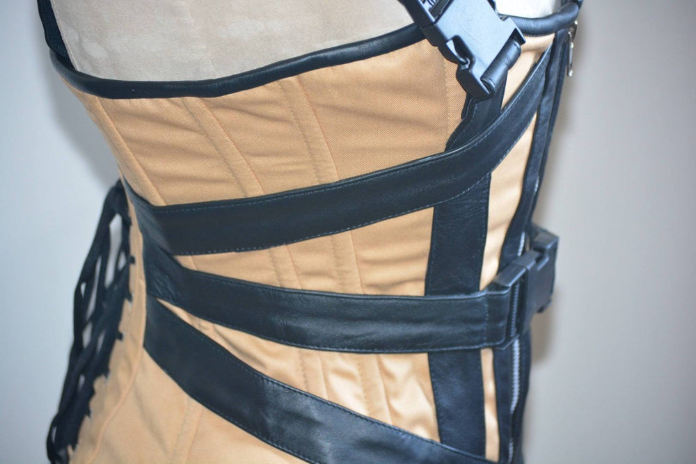 The size of the corset reveals real measurements of the waist of the corset when it is mostly tightened. The back of the corset has 5,5 inches of modesty panel. Corset gives up to 15 cm tightening, so choose size minus at least 2-3 inches from your real waist sizes (we recommend 4 inches). After you place an order send us your natural measurements for custom size. After you place an order sends us your natural measurements for custom size: underbust, natural waist, waist of the corset, and hip bones. Please add 1-2 inches if you are planning to wear it on your clothes.