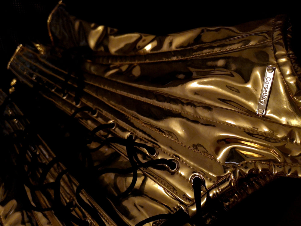 Historical pattern overbust corset vest from gold PVC. Steelbone custom made corset