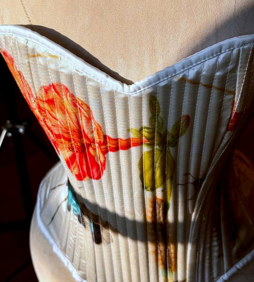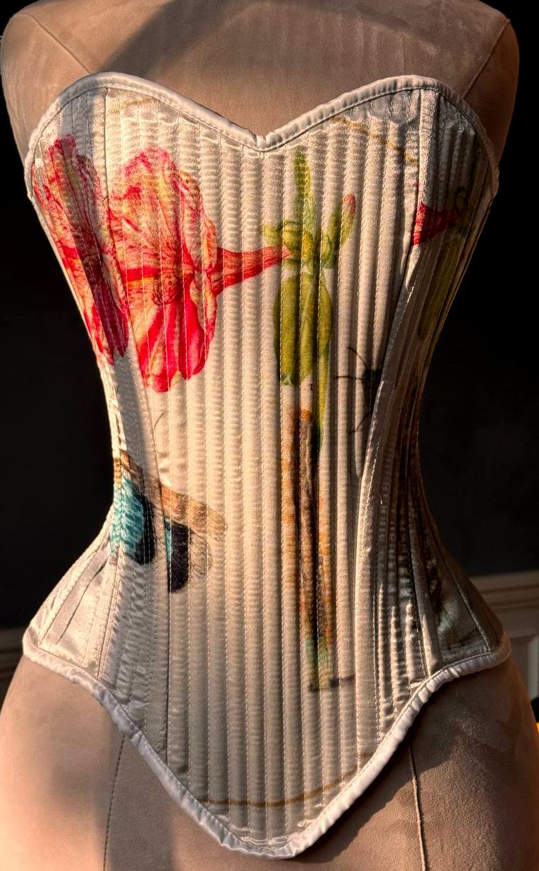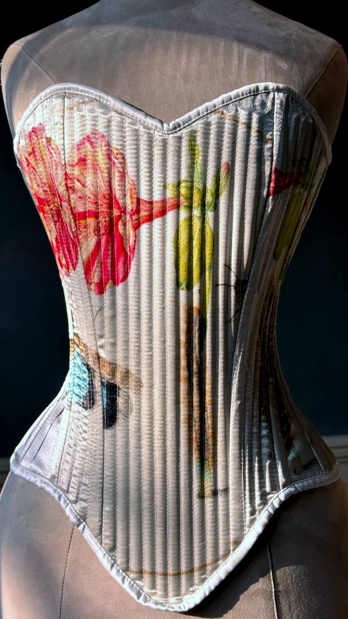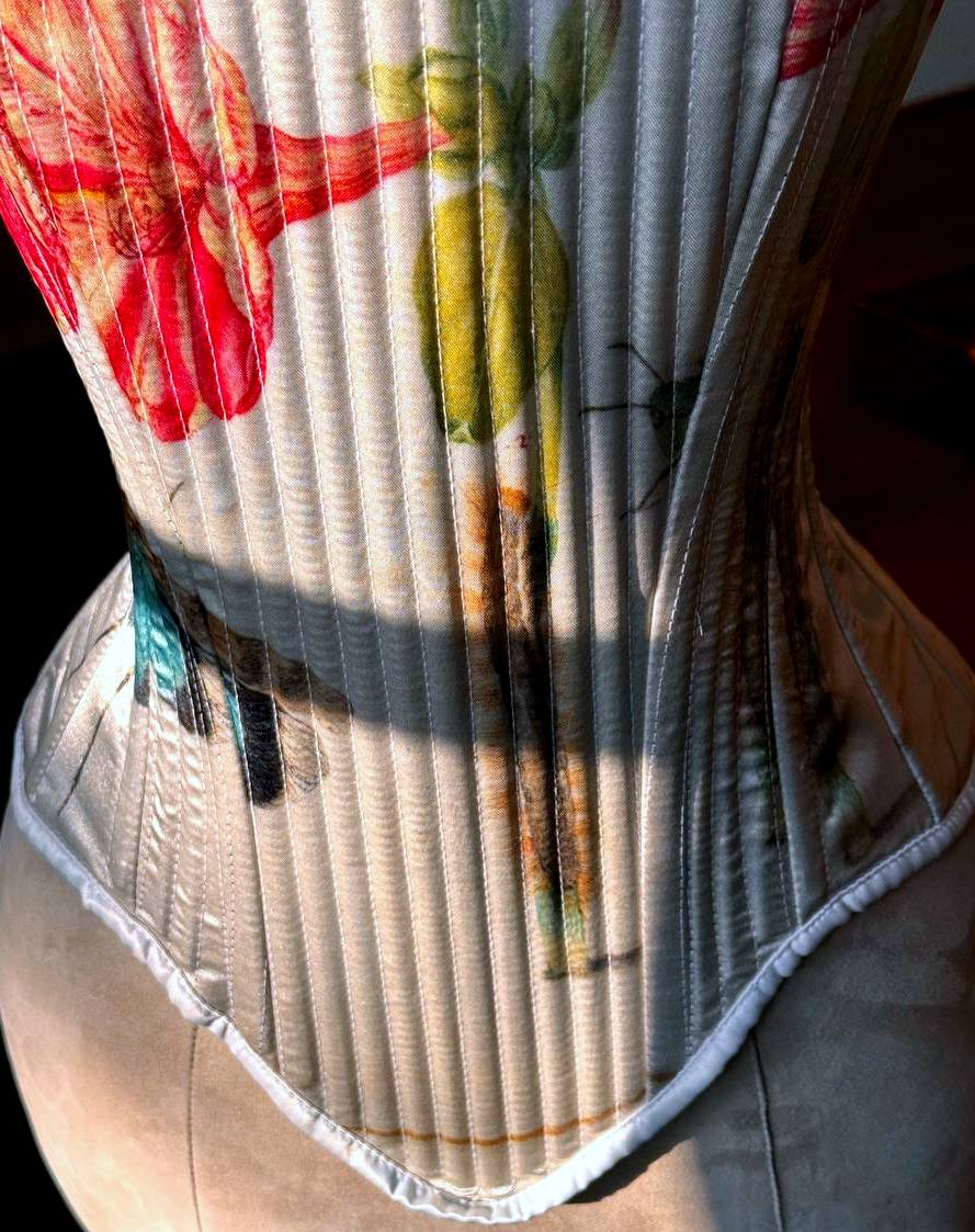 Ossos: compostos por 40 ossos de aço espiral e ossos de aço na parte traseira do espartilho (44+ ossos de aço no total, dependendo do tamanho). A parte de trás é coberta por um painel de modéstia.
