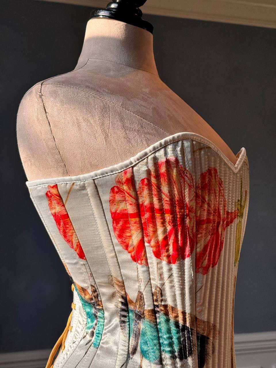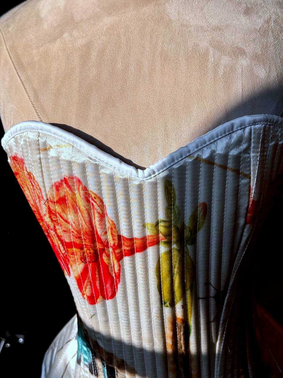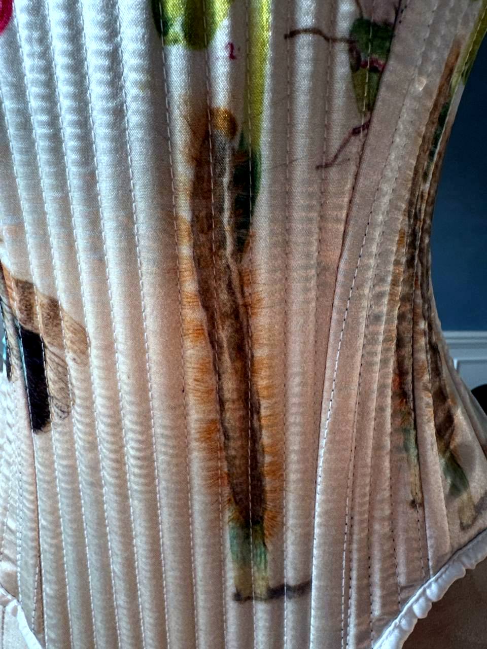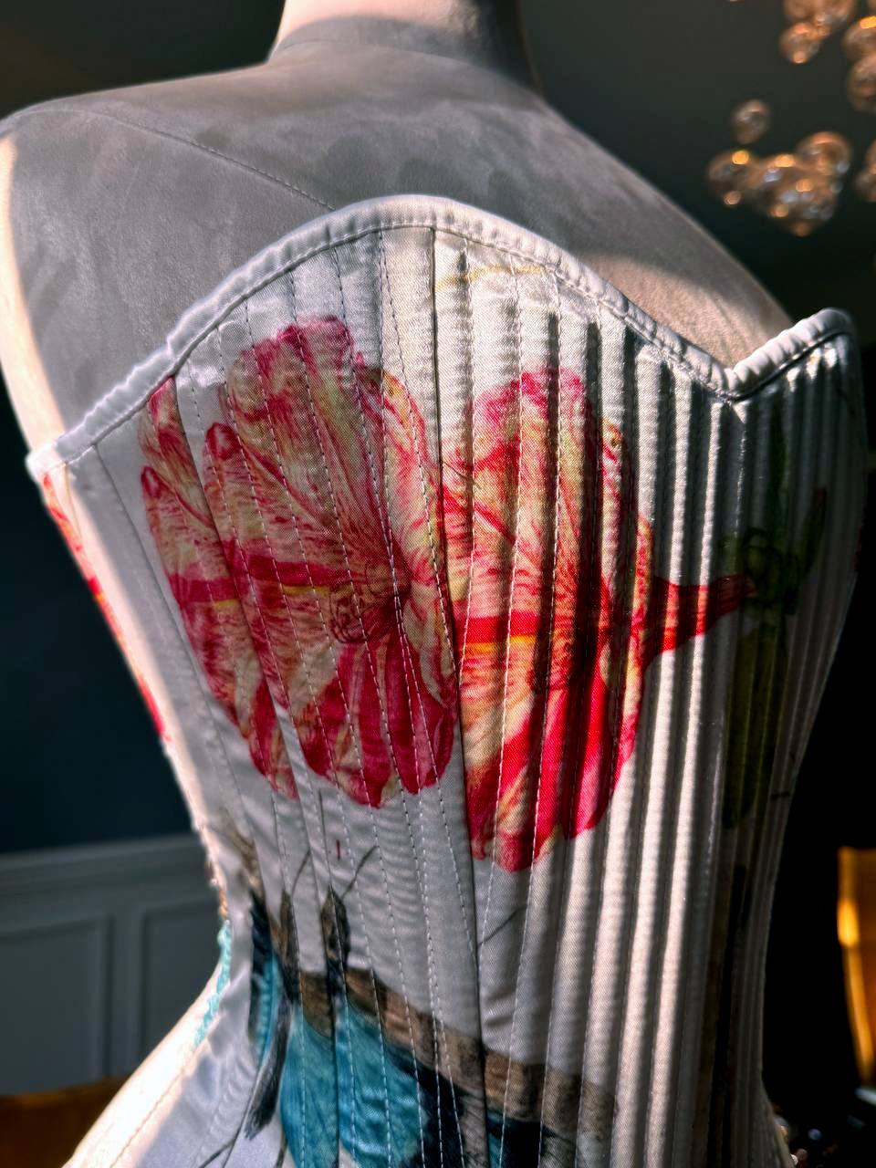 Ossos: compostos por 40 ossos de aço espiral e ossos de aço na parte traseira do espartilho (44+ ossos de aço no total, dependendo do tamanho). A parte de trás é coberta por um painel de modéstia.