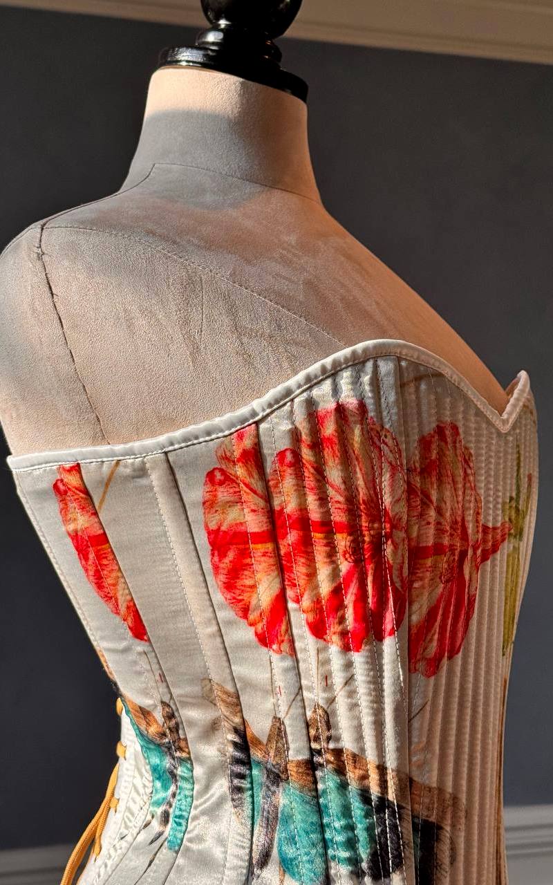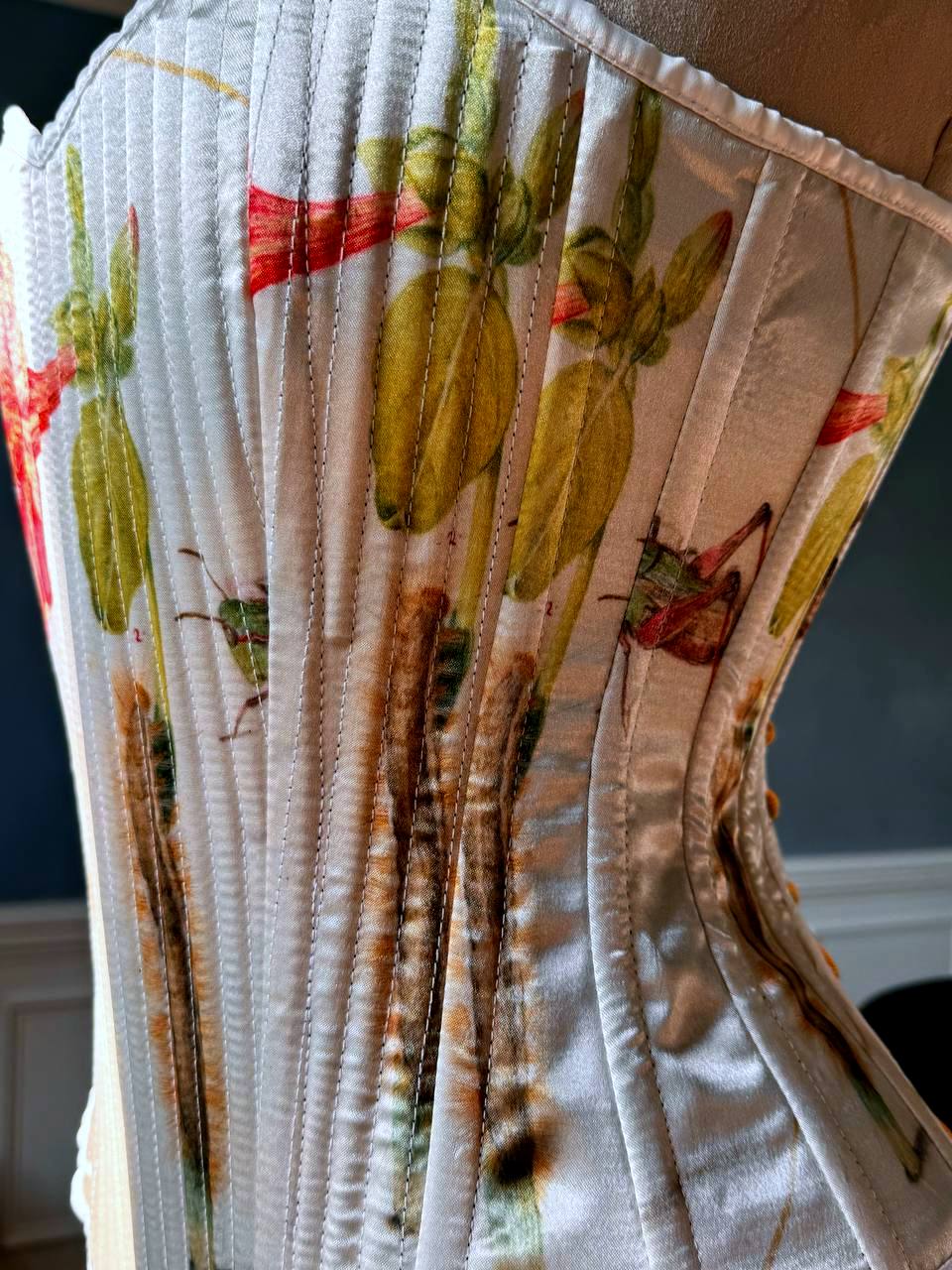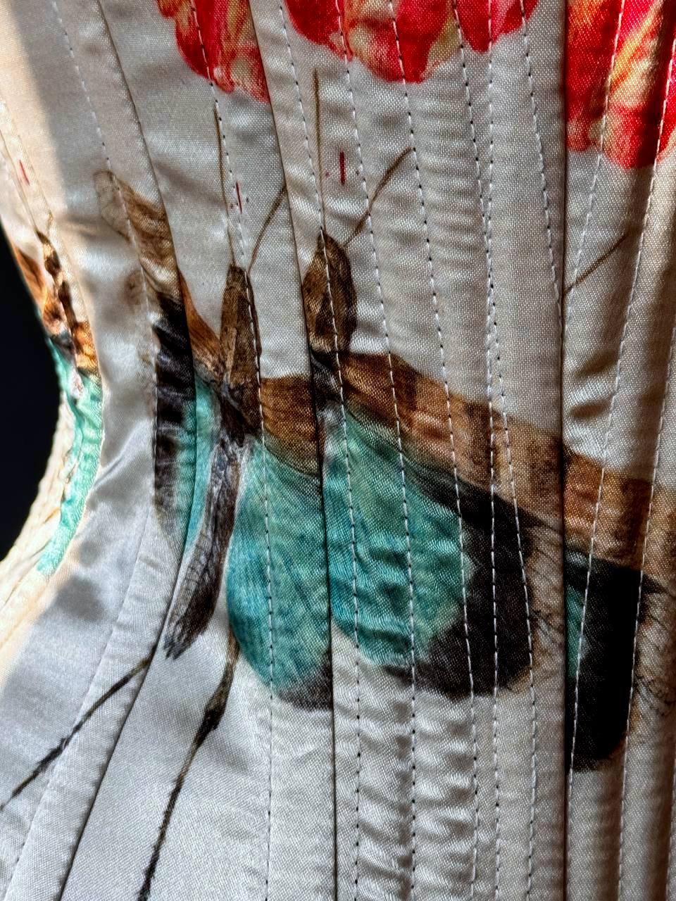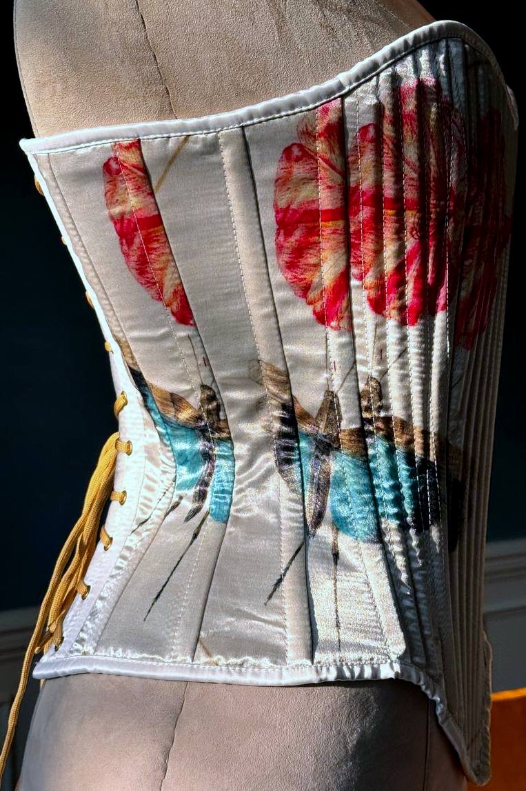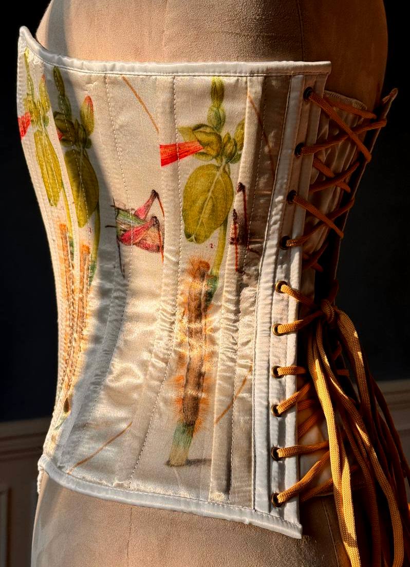 The Corpete Firebloom & Moth apresenta um fragmento encantado do Animalia Rationalia et Insecta (Ignis) bestiário — flores delicadas com pétalas em forma de trombeta, vagens de sementes maduras e o fantasma de uma mariposa cor de fogo, capturado em pleno voo. Pernas tênues de insetos se arrastam entre as costelas do espartilho, enquanto formas de plantas se entrelaçam como feitiços deixados inacabados.